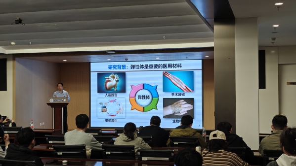 报告中,游正伟教授系统分享了他带领的团队在破解弹性体性能矛盾、拓展其生物医学应用方面的系列创新工作。他指出,弹性体虽在组织修复与生物电子等领域前景广阔,但其低模量、高强韧、自修复、易加工等性能往往难以兼顾。针对这一核心挑战,游教授团队通过设计多种可逆相互作用的协同机制,取得了一系列突破:一是建立了酸诱导环氧开环聚合等方法,构建了软而强韧的可生物降解弹性体,成功调和了高强度与低模量之间的矛盾;二是合成了一系列聚氨酯弹性体,利用金属离子的双重作用同步提升材料力学强度与自修复能力,并基于此在国际上率先提出了“体内原位愈合组装”医疗器械的新策略,为动脉瘤治疗提供了全新方案;三是创新性地发展了食材辅助策略与系列新型3D打印技术,成功制备出可降解电子器件、多功能心肌补片等先进功能器件;四是首次通过熔融纺丝制备出高弹性共价交联纤维,并赋予其光电特性,拓展了在柔性传感与发光器件等领域的应用。